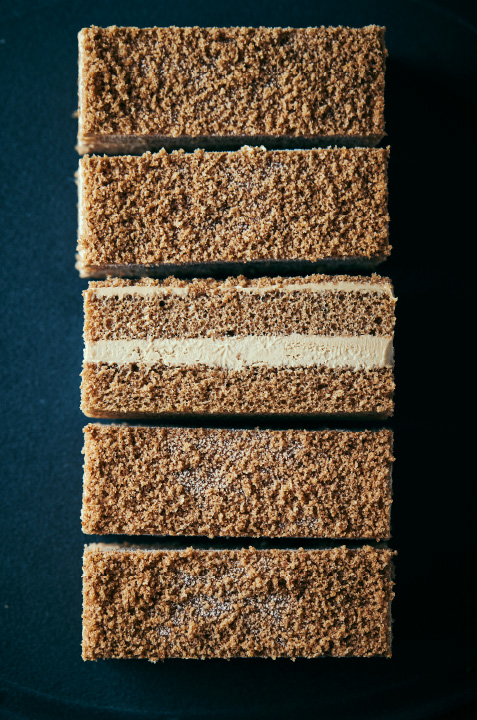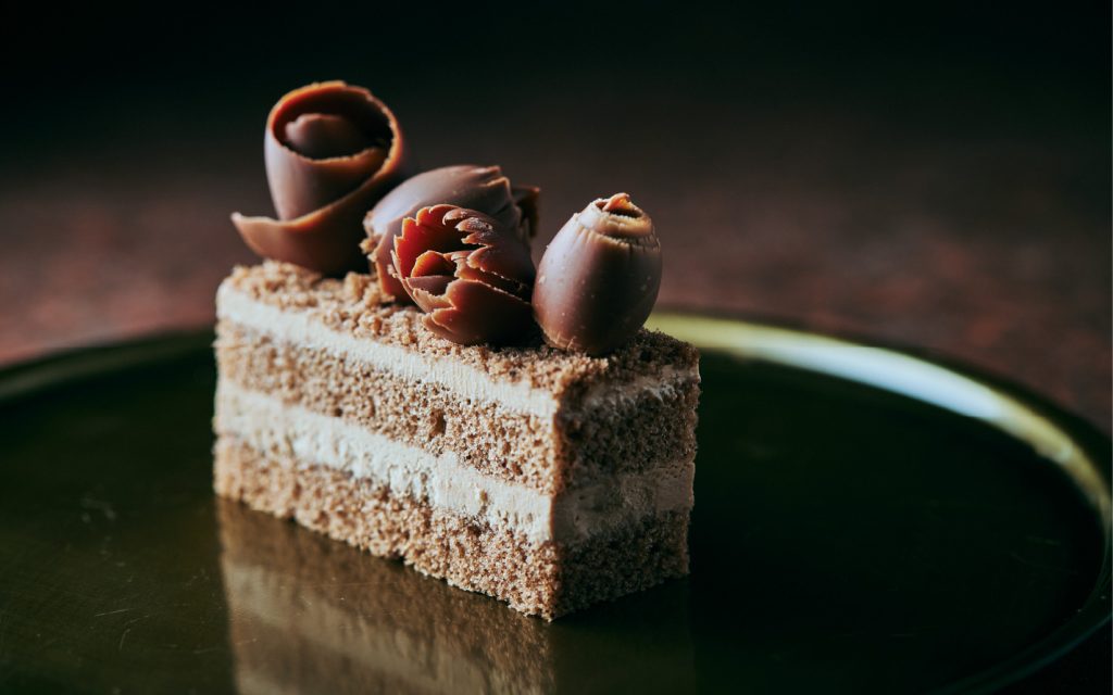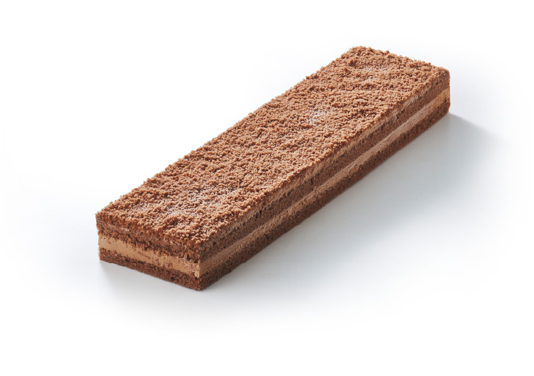 トリュフチョコレートのガナッシュのような口どけをケーキで表現できないかをテーマにし、製法(ガナッシュ・モンテ)を採用しガナッシュクリームを泡立てることで、軽さや口どけをイメージしました。クーベルチュールミルクチョコレートにコアントロー、北海道産生クリーム、バターを加え香り高いクリームに仕上げ、表面のスポンジクラムをプラスすることでやわらかい食感の変化を楽しめるよう設計しました。