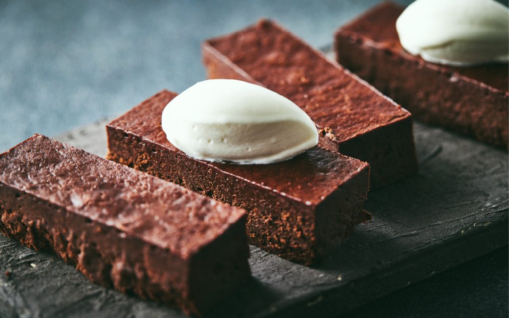 しっとりとした食感と、濃厚さの中に食べやすさと軽さをイメージ。焼き上がりの温度を変え、メレンゲの泡立て方を変え、チョコレートと生クリームの組み合わせを考え試行錯誤を繰り返し、独自の製法で作り上げました。